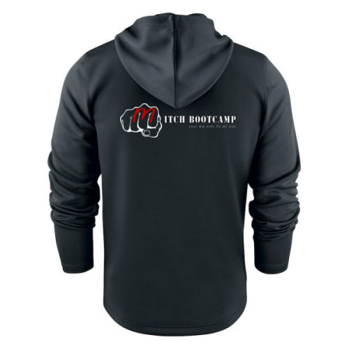 Sweatshirt met lange ritssluiting en capuchon in strectchmateriaal. Twee voorzakken in contrasterende ritssluitingen en decoratieve flatlock naden.